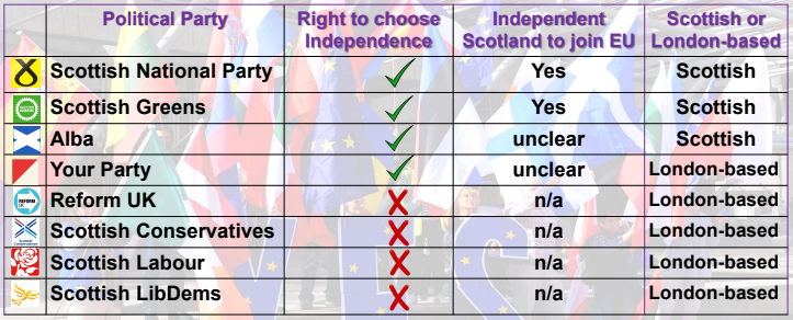 This chart shows the policies of each of the main parties, and we strongly recommend voting for a Scottish party/parties committed to both Independence and EU membership for Scotland!