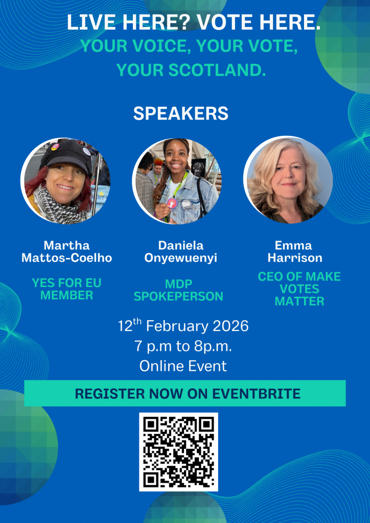 A practical online session on 12 February at 7pm, facilitated by one of our members, Martha Mattos-Coelho – for those who want to find out more about the WHO, WHY and HOW of voting in Scotland ahead of the Holyrood elections on 7 May. More information and registration via Eventbrite here.